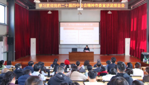 根据市委统一安排部署,11月20日上午,学习贯彻党的二十届四中全会精神市委宣讲团报告会在我校阶梯教室举行。市委宣讲团成员、市委组织部副部长蔡必盛作宣讲报告。校党委书记叶超主持报告会。校领导胡平先、邹思俊、陈慧斌、李芸,全体党员干部、部分教师和学生代表聆听了报告。