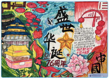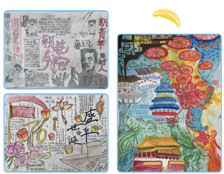 家国情怀是画卷中最动人的底色——“盛世华诞76周年”作品里,耀眼五星与古朴天坛相映成趣,雍容牡丹点缀其间,红金交织的色调尽显庄重热烈,细腻笔触勾勒出对祖国的深情热爱与美好祝福,家国情怀扑面而来;“新青年”作品尽显青春朝气,利落线条搭配简约素描风格,将新一代少年的蓬勃活力与传承担当具象化,让“薪火相传”的寓意跃然纸上。