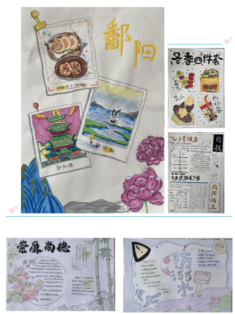 生活中的温情与地域的特色也在作品中淋漓展现。“冬季四件套”作品满是烟火气,冰糖葫芦的红、糖炒栗子的棕、烤地瓜的暖黄与热奶茶的氤氲,勾勒出冬日里的小确幸。“鄱阳风光”作品更具辨识度,浩渺鄱阳湖、灵动候鸟与古雅鄱阳楼构成绝美生态画卷,油酥饼、桃酥等特色美食的刻画,更藏着对家乡的深情眷恋。此外,“心理健康”“防溺水”“崇廉尚德”等作品,将育人理念融入艺术创作,让美德与安全知识在熏陶中自然渗透。